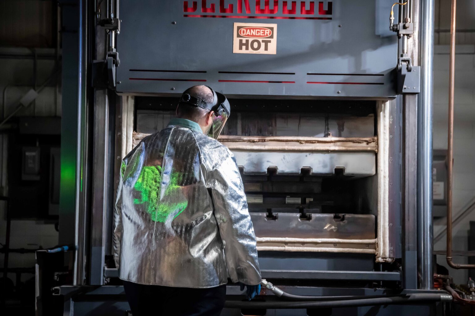 A hot-forming press forms materials such as titanium, precisely as the name suggests, by applying heat. A blank is placed in the machine, which then has to come up to temperature, usually between 1100°F and 1350°F. Once the machine has heated to the proper temperature, it presses the material into the desired shape. Then, it holds it in that position for a set length of time, determined by the complexity of the shape. Once the press has been released, an operator removes the blank, allowing the shape to begin the cooldown process.